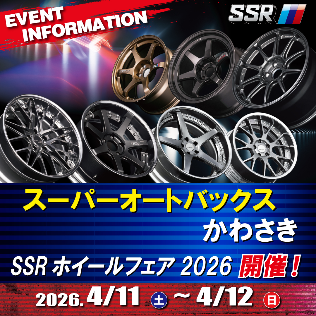 4月11日(土)〜12日(日)の2日間、スーパーオートバックスかわさき様にて 「SSRホイールフェア 2026」が開催されます。 SSRの2026年度新作ホイールが勢揃い! 気になるアイテムを間近で見るチャンス! さらにイベント期間中は通常よりもお得な特別価格にてご提供! 春のわくわくドライブに向けて、検討してみてはいかがでしょうか? 皆様のご来店をお待ちしております。 店舗情報 スーパーオートバックスかわさき 住所:神奈川県川崎市川崎区港町9-8 TEL:044-223-4774