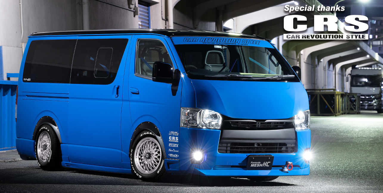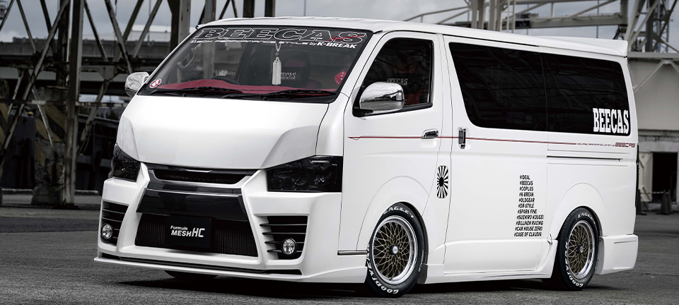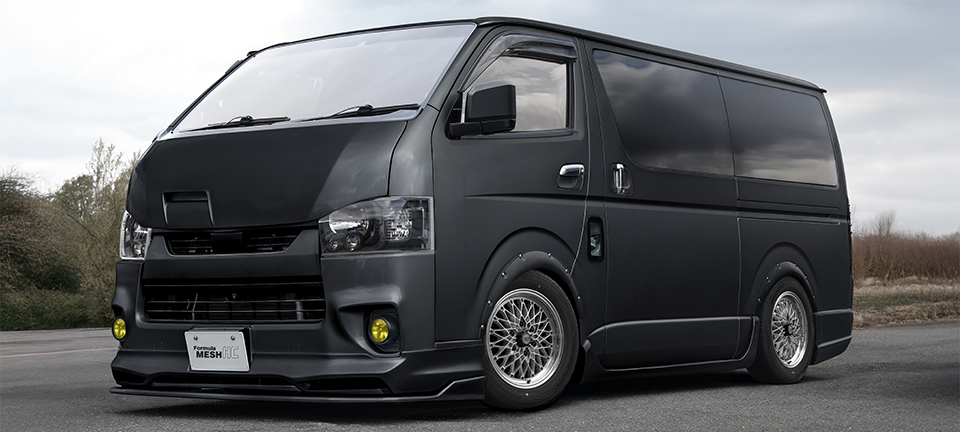 製品の特長 MESH LINE フォーミュラ メッシュのデザインを踏襲した上で、ハイエースに設定された高負荷強度基準をクリアするために、メッシュラインを最適化している。 CENTER PART センター部は6つのナットホールをデザインに取り込んだ星形を描く。広がりとボリューム感を兼ね備え、ハイエースに相応しい重厚な佇まいを演出。 FASTNER メッシュの先端に台座を設けてクラシカルピアスを装着。ファスナー部は軽量化のために肉抜きしたフォーミュラ メッシュの最初期モデルを彷彿させる形状に。 FLANGE リムはSSR独自の"FFT-R"でシビアな肉厚にて成型。強度はもちろん、アウター側のリム形状は切削による最終仕上げで高級感を演出。