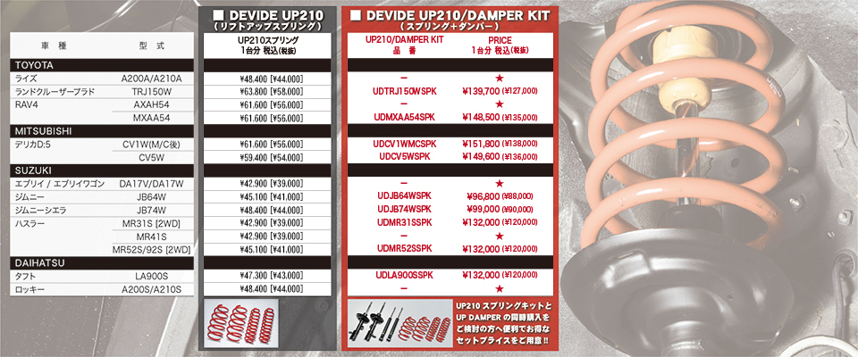 純正と交換するだけで、迫力のあるリフトアップスタイルを実現するDEVIDE UP210スプリング。冷間成形スプリングならではの乗り心地の良さはそのままに、さらなる走破性と快適性を高次元で融合させる「DEVIDE UP DAMPER」は、ワンランク上の快適な乗り心地を求めるためにタナベとカヤバが共同開発したUP210専用のショックアブソーバです。